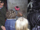 bread, live (but sleeping) hens, a goat and her kids, a man turning a